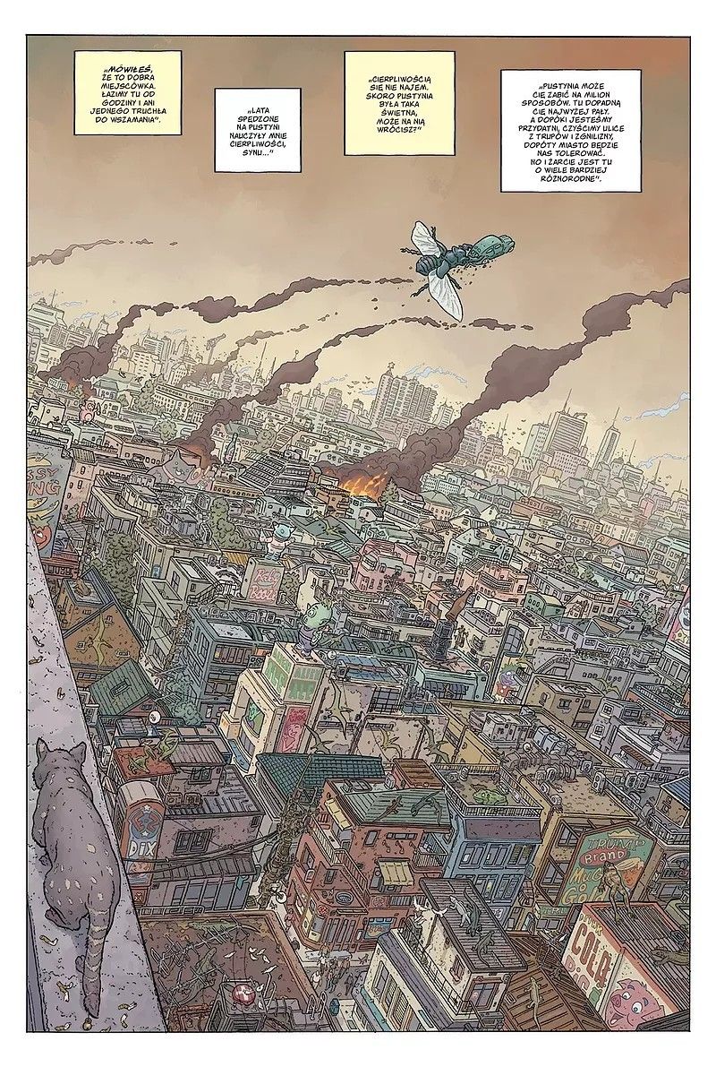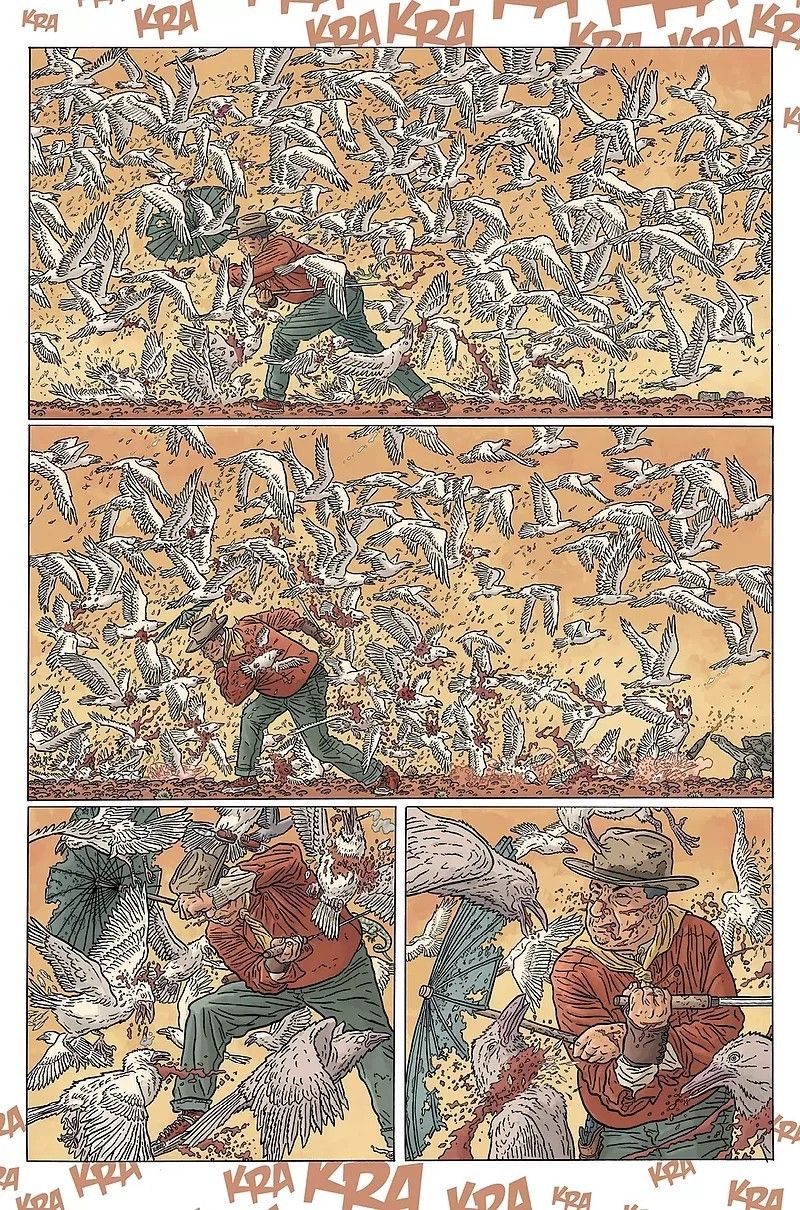 Geof Darrow nie krępuje się umieszczać obok siebie portretów Trumpa, Hitlera i Jezusa, do tego w anturażu rozmaitych haseł nacjonalistycznych czy odniesień do organizacji jak ruch MAGA czy NRA. Ale i z drugiej strony pojawia się BLM. Nawet biorąc pod uwagę całą pieczołowitość jego warsztatu, czasem bywa to głupawe. Nie jestem wrażliwcem i przy pierwszym pojawieniu się takiego zestawienia wydawało mi się ono nawet pozytywnie prowokacyjne. Ale potem powtórzyło się kilka razy. W wielu różnych punktach. Przeplatane żartami na poziomie kloacznym. I złego wrażenia, a nawet zmęczenia materiałem, nie uratował kunszt autora. Choć tu ponownie muszę pochylić czoła. Geof Darrow to solidna rysownicza marka. A byłaby solidniejsza, gdyby oddał komuś pisanie scenariusza.