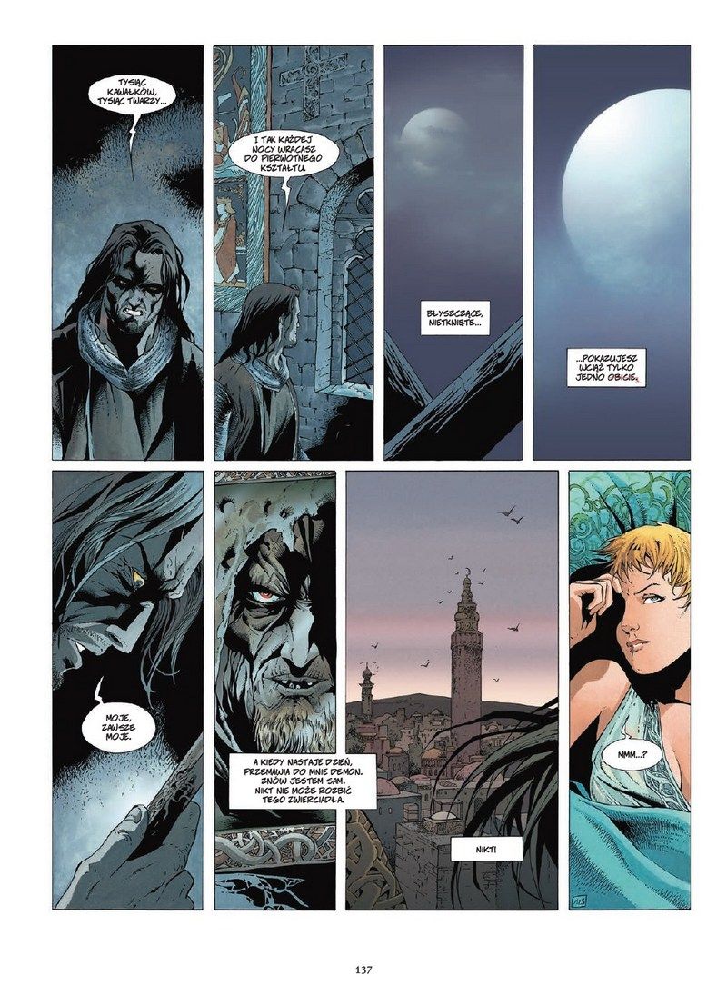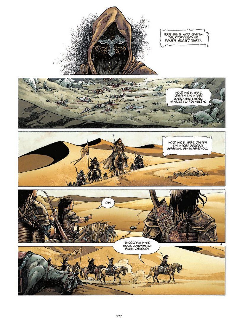 Cudowny jest sposób ukazania świata. Wspomniane istoty magiczne i boskie to jedno, ale w kadrach pojawiają się persony jak Władca Machin – chodząca odpowiedź na pytanie co by było, gdyby Mad Max osadzony był w wiekach średnich. Krucjata wynosi motyw wypraw krzyżowych na nowy poziom, nie tracąc przy tym surowego ducha epoki wiary i miecza. Gdybym jednak jakimś cudem nie miał pojęcia o tym, że krucjaty miały miejsce, obstawiałbym, że to dzieło wyobraźni twórcy Dwóch masek, rodem z historii alternatywnej. Monumentalność godna Diuny czy Gry o tron, lecz ukierunkowana w stronę misternego dark fantasy. Czasem ilość wydarzeń może przytłoczyć, ale scenariusz Dufaux ilustrował rysownik doskonale rozkładający napięcie i ciężar całej opowieści.