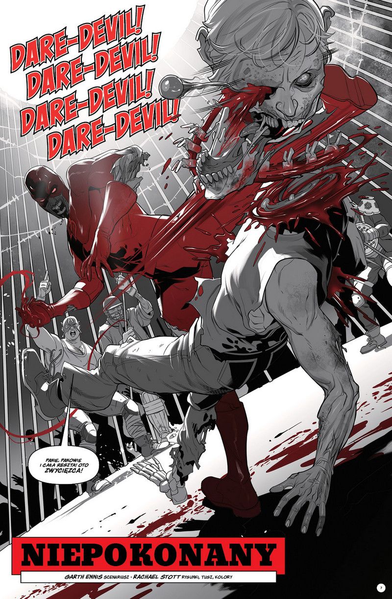 Jak zwykle w przypadku komiksów z serii Czerń, biel i krew, tak i tu mam swoich faworytów, na których czele stoi Niepokonany. Garth Ennis ukazuje w nim dość podły los zombie-Daredevila, który zamiast cieszyć się chwilą i mózgami swych ofiar, jest więźniem grupy ludzi wystawiających go na arenie. Już pierwsza historia pokazuje charakter całej antologii. Brutalność, poczucie beznadziejnej walki, ale też często zaskoczenie i innowacja. To nie kolejne historyjki o zjadaczach mózgów, a bardziej seria literackich eksperymentów.