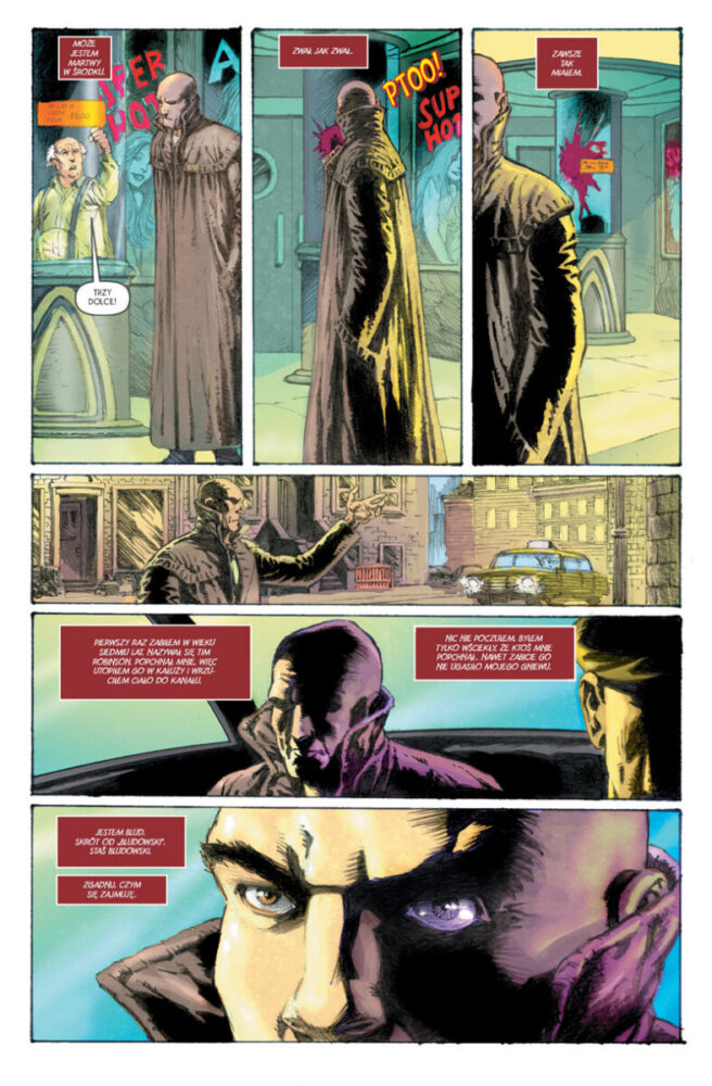 Bernie Wrightson to wielkie nazwisko komiksu i gwarancja udanych ilustracji. Ale czasem nawet mistrzowie w swych fachu tworzą dzieła poniżej swej średniej. W Mieście innych autor zażyczył sobie nałożenia kolorów bez uprzedniej ingerencji inkera. I niestety „na surowo” jego prace nie wyszły tak, jak pociągnięte solidną porcją czerni. Blud wygląda jak przeciętny bohater z łysą głową i zaciętą gębą. Również wampirzemu towarzystwu bliżej do grupy arystokratów pijących co najwyżej dobre wina, niż posokę. Jedynie makabra zachowała swój charakter, choć odnoszę wrażenie, że Wrightson nadmiernie epatował tu anatomią, budzącą raczej skojarzenia ze sklepem mięsnym niż klimatom gore. Podobnie jak w przypadku reszty komiksu, gdzieś tam tli się potencjał, ale dostrzeżenie go wymaga sporych pokładów dobrej woli. Miejscami bywa bowiem, że rysunki wyglądają jak powinny, zwłaszcza gdy Jose Villarrubia pozwala sobie na bardziej nasycone kolorowanie.