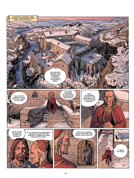 Za oprawę wizualną odpowiada znakomity François Miville-Deschęnes. Nie szukajcie tu jednak rycerzy i pięknych zamków. To wieki średnie u swych początków, gdzie co prawda spotkać można było typowe pejzaże z epoki, ale nic tu nie lśni, a jeśli już, to pewnie jakaś diabelska sztuczka i trzeba uciekać. Nie wspominałem o elementach fantasy, których jest tu niemało. Na lądzie grasują ghule, w morzach pływają krakeny, a niektórzy dysponują magicznymi artefaktami, których nie powstydziliby się magowie. Miville-Deschęnes ugina jednak to całe sacrum do szaro-brązowego profanum i jeśli ktoś ma alergię na wróżki i czarodziejów, niech się nie obawia Milenium. To bowiem lektura, w której magia i wszystkie jej elementy są jak ówczesna rzeczywistość.