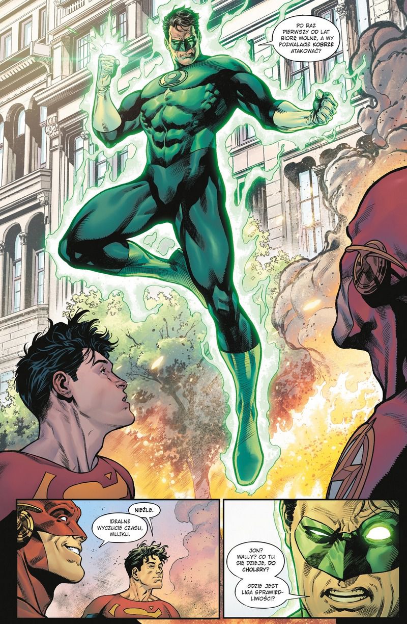 Nie oczekiwałem po tym albumie rysunkowych szaleństw, choć miałem nadzieję na ich promil. Ma być jednak show. Ma być walka na wielką skalę, a czasem chwila wytchnienia, jednak bez bezeceństw i jakiegoś tam artyzmu. Daniel Sampere jest więc najlepszym człowiekiem do zilustrowania głównej linii historii. Zgrabne, sceniczne, okładkowe wręcz superhero. Inni zresztą idą podobną drogą, co nie jest wadą, ale brakuje mi tu smaczków jak w Batman Metal, gdzie średnia superbohaterska rysunków występowała, ale przeplatana była od czasu czymś śmielszym. Tu jest spokojniej. Co nie oznacza, że nudno, bo jako fan Green Lanternów jestem zadowolony z ich wyczynów i obecności.