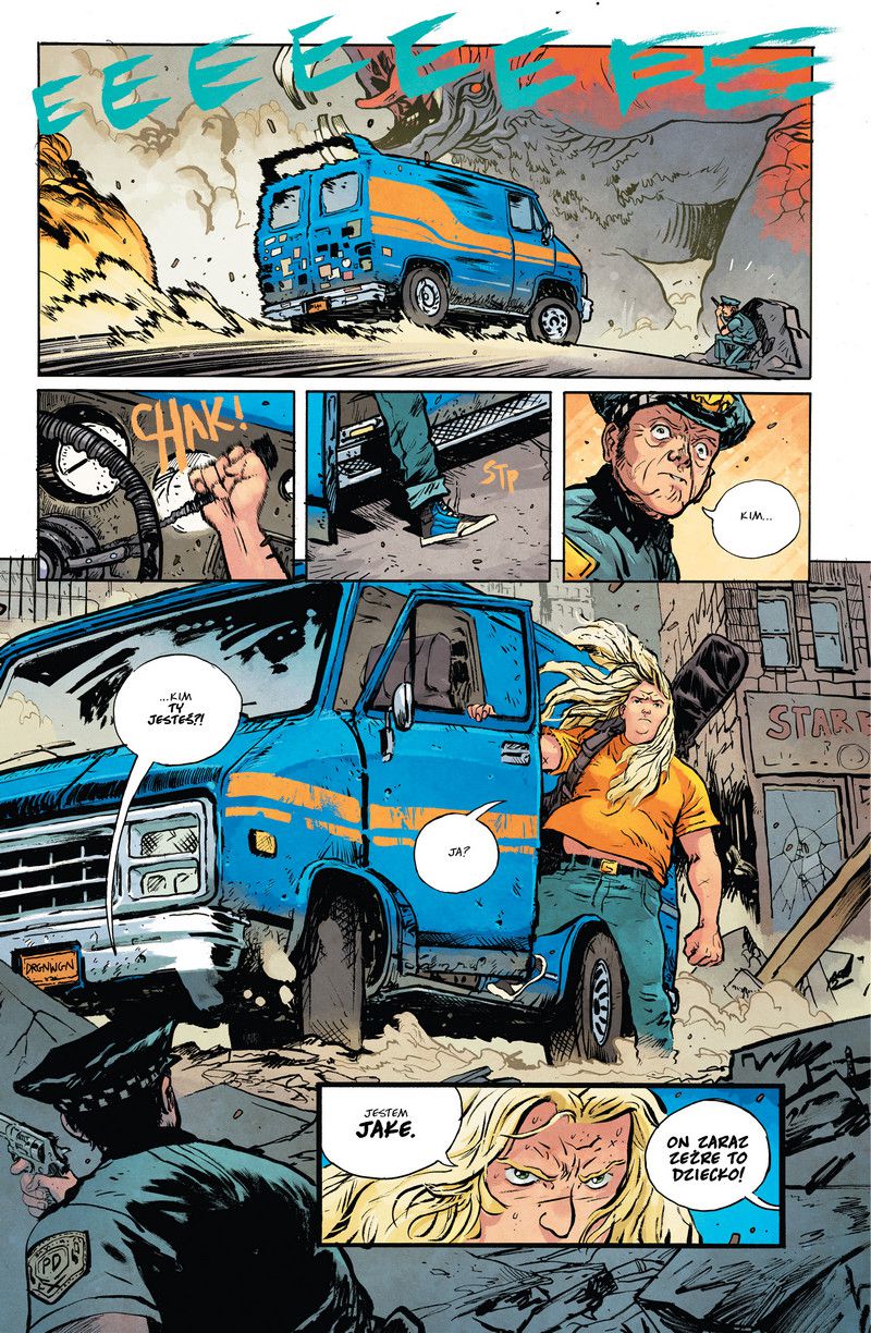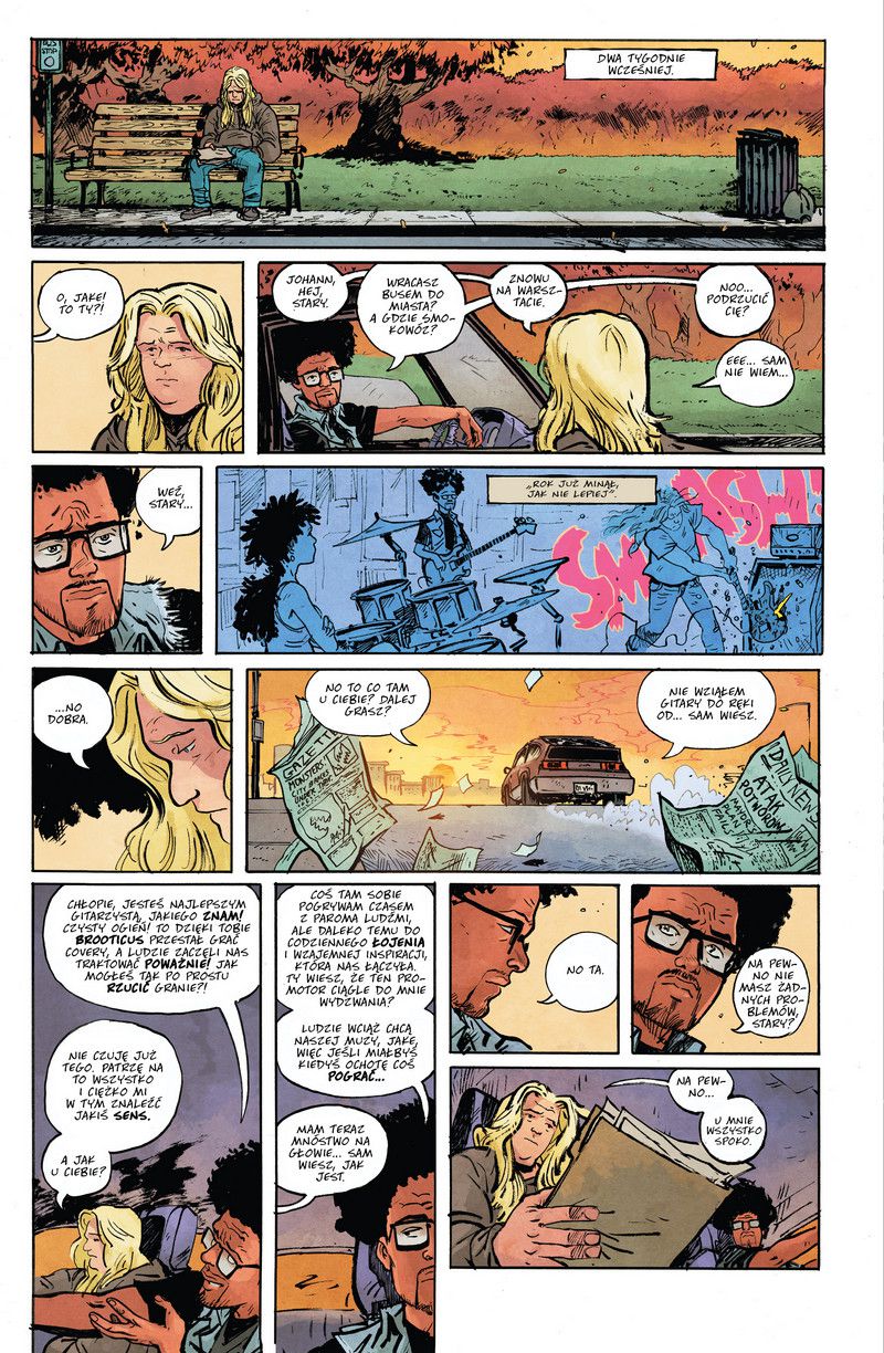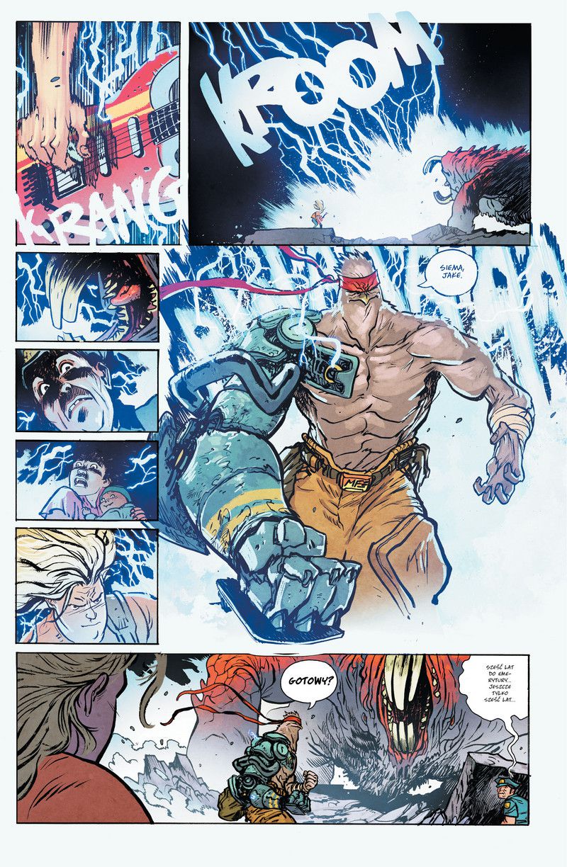 Ponownie rysunki DWJ nie zawodzą. Po pierwsze – team Jake/Sokół. Kontrast między nimi jest spory. Jake to zwyczajny chłopak z gitarą, a jego kompan to szalony projekt humanoidalnego ptaka z metalową ręką i opaską w stylu Rambo na głowie. Ale jakże to współgra! Po drugie – Johnson nie hamuje się w skali swej opowieści. Mamut, wielki samuraj czy morski jaszczur – to wszystko stoi po stronie ludzkości w walce z Magnum Chaosem. Brzmi trochę jak senne wizje małolata, ale doskonale sprawdza się w tej historii, pozwala rozluźnić napięcie wynikłe z emocjonalnej warstwy historii i robi show. No i nie mogło obyć się bez gościnnego pojawienia się legend metalu. Podobnie jak w przypadku Z całej pety!, kolorami zajął się Mike Spicer i temu panu również należy się ukłon.