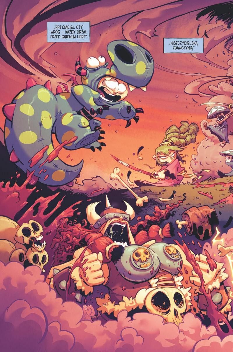 Skottie Young to twórca rozpoznawalny. Zwłaszcza jako rysownik wyróżniający się swoją uroczą, kreskówkową kreską. Przy całej cukierkowatości swych prac potrafi jednak się przełamać i dać czytelnikowi coś zupełnie odwrotnego. Nienawidzę Baśniowa to komiks, który mógłby nieopatrznie zostać kupiony przez rodzica dla swej pociechy. I jeśli ów dzieciaczek to osoba wrażliwa, niefrasobliwy opiekun zafundowałby mu małą traumę. Nienawidzę Baśniowa tom 5: Gert w piekle nie jest jednak okładkową pułapką. Widnieje bowiem na niej postać bliższa panteonowi przeciwników Batmana, niż dziecięcym bohaterom. I słusznie, bo przedstawiona tu przemoc i inne niepoprawne treści wywołałyby jeszcze szerszy uśmiech na gębie Jokera.