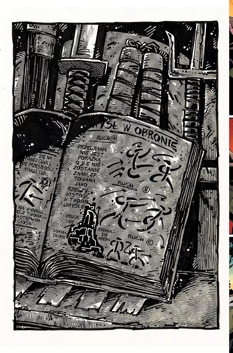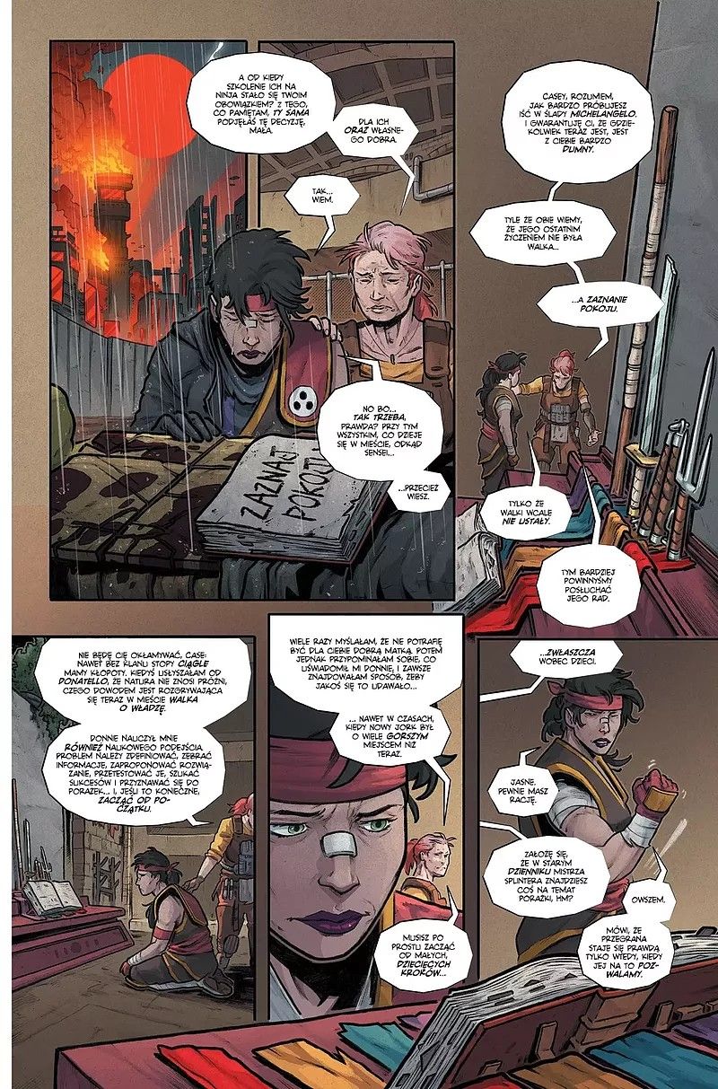 Spodziewałem się komiksu w najlepszym wypadku grającego motywami z poprzedniego tomu. Eastman i Waltz jednak zaskoczyli, uderzając w zupełnie inne tony. Tułaczka Mike’a to bolesna droga w poszukiwaniu nowej wersji samego siebie. Bez rozdmuchanej dramaturgii, ale z wątkami na tyle poważnymi, by zdominowały inne aspekty jego opowieści. To całkowicie moje klimaty. Umiarkowana psychologizacja, nieco więcej mroku i cierpliwie kreowany proces przemiany. I gdybym słyszał jedynie skrót tej opowieści, stawiałbym ją wysoce historię z młodzikami. Po lekturze obu części bliższa memu sercu jest jednak opowieść nowej generacji pancernych ninja.