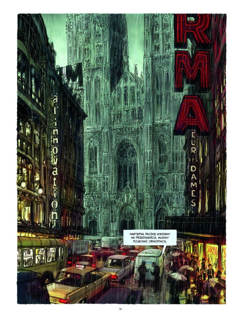 Pralnia niespecjalnie zaskakuje fabułą. Jeśli już, to warto zwrócić uwagę na filmowe rysunki Jorisa Mertensa, który kreśli ciemne, smutne, ponure i zalane deszczem niesprecyzowane miasto. Ludzie tacy jak Francois stoją w nim we wiecznych korkach i ledwo wiążą koniec z końcem, ale wystarczy zerknąć za wybudowany za rogiem luksusowy hotel, by zrozumieć jak rozwarstwione jest tu społeczeństwo. Scenarzysta i rysownik zarazem jest bardzo oszczędny w dialogach, na wielu panelach nie pada ani jedno słowo, a inne zachwycają swoich architekturalnym rozmachem, by czytelnik rozumiał jak malutki wydaje się w tym wszystkim nasz bohater.