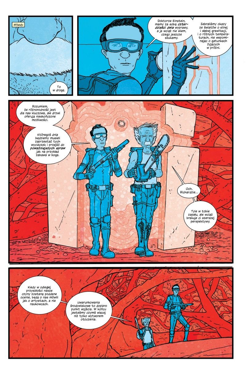Jonathan Hickman pokazuje, że potrafi stworzyć nie tylko śmiałe i monumentalne dzieło, ale przy tym burzyć pomniki i bawić się absurdalnym humorem. Weźmy kwestię podwójnych Oppenheimerów i Einsteinów. W przypadku tego pierwszego to konflikt w rodzinnym i bardzo wewnętrznym środowisku. Twórca bomby atomowej to zresztą postać moralnie żarłoczna, poszerzająca wiedzę na kanibalistyczną modłę. Równie ciekawie jest z Albertem i Albrechtem. Ojciec teorii względności nie jest tak genialny, jak mu się wydaje, co wcale nie przeszkadza mu stworzyć sojusz ze swoim alternatywnym, bardziej okrutnym odpowiednikiem. Jest jeszcze kwestia pozaziemska, dotyczącą Gagarina i Łajki, ale to już opowieść w space operowych klimatach. Hickman nie powziął sobie za cel stworzenie ultra-naukowego high SF, ale i tak dał nam rozrywkę, która wymaga pewnego zrozumienia. Może nie od razu znajomości biografii każdego z bohaterów i jego dokonań, ale pewnego dystansu do spraw poważnych.