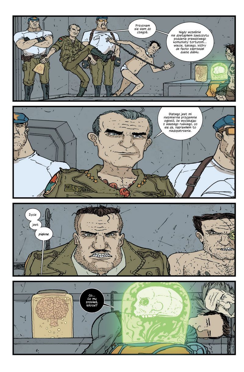 Tytuł komiksu zobowiązuje, więc pojawia się i polityka, zwłaszcza ta związana z Zimną Wojną. Mieliśmy okultystycznego sekciarza Trumana, wirtualnego Roosevelta, teraz przyszedł czas na Kennedy’ego. Jack ukazany jest tu równie kontrowersyjnie co jego poprzednicy. Nie od dziś wiadomo, że JFK podejrzewany był o miłość do pięknych kobiet i mocnych „leków”. Istotny jest tu Leslie Groves – z militarnego nadzorcy oryginalnego Projektu Manhattan, stał się demiurgiem naukowego tygla, a Westmoreland mógłby zmierzyć się z samym Rambo. Na płaszczyźnie historyczno-politycznej twórca Black Monday Murders również sobie folguje i sporo pomagają mu w tym rysunki Nicka Pitarry. Swoją drogą… Biorąc pod uwagę wydarzenia ostatnich tygodni, zwłaszcza w kontekście lokatora Białego Domu, Hickman miałby poważny problem jak bardziej ośmieszyć sytuację na świecie.