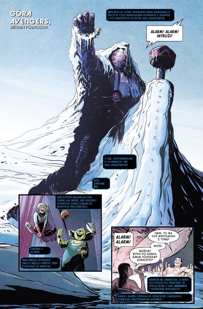 Jest jeszcze jedna rzecz, o której warto wspomnieć. Przedwieczni nie byli rozwijani z taką regularnością jak Avengers i cała reszta trykociarskiej hałastry. Najświeższa chronologicznie pozycja z nimi to dzieło Neila Gaimana i JRJR-a, a po niej nastąpiły wydarzenia, których u nas brak. Na szczęście Gillen nieco o nich wspomina, ale istotniejsze jest to, że odświeża i uwspółcześnia ich wizerunek. Przedwieczni może i są półbogami, ale targają nimi ludzkie namiętności. Bywają zróżnicowani moralnie i przy całej swej potędze, nie są niepokonani. Ot drobna sprzeczka z Mścicielami. Kieron Gillen pokazał wiele razy, że potrafi stworzyć wyraziste postaci, ale tym razem wyraźniej nakreślił sylwetki weteranów Marvela. Bez kalania ich mitu, w czym pomogli mu ilustratorzy.