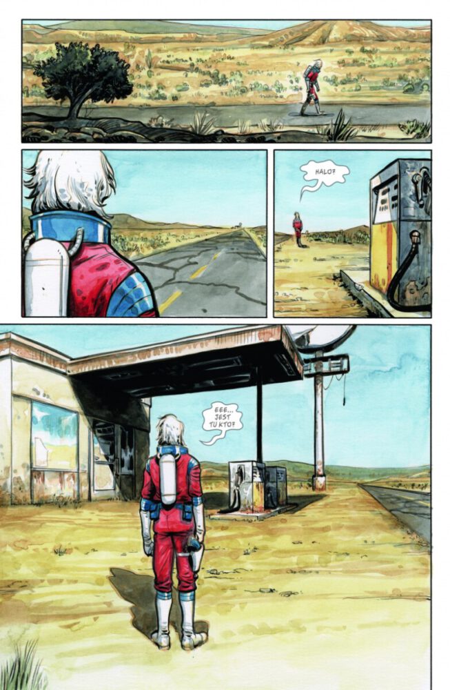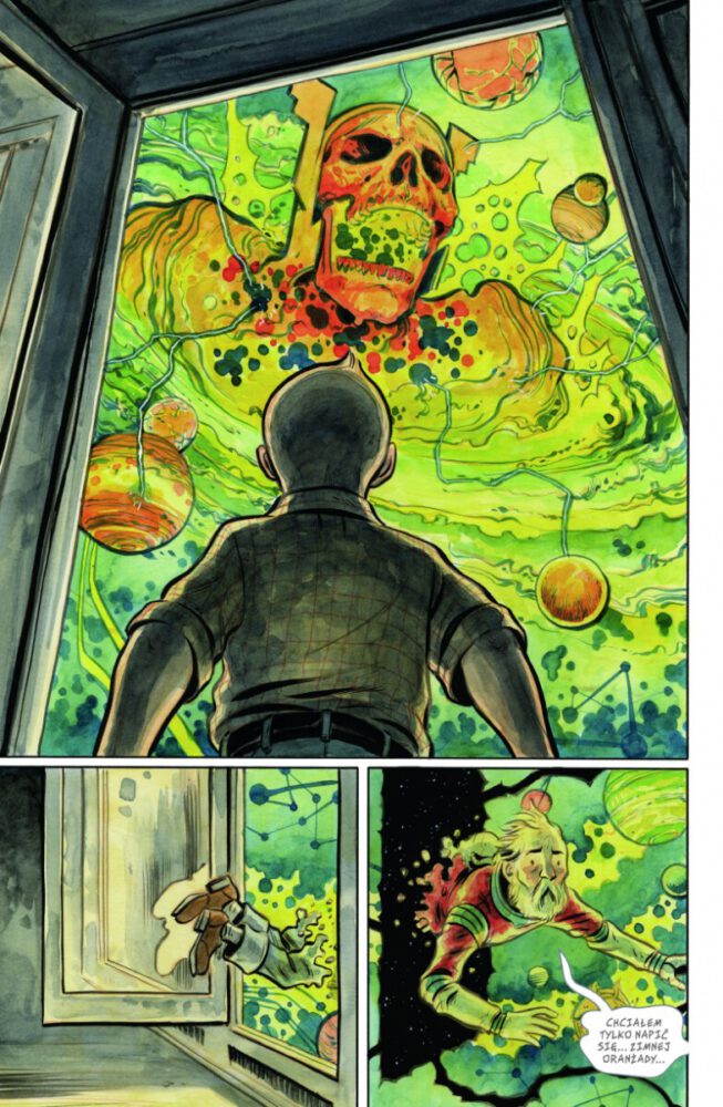 Tylera Crooka kojarzę z nieco potworniejszymi kadrami z tytułów Mignolawersum, ale tu, mając na głowie kilka epok i wcieleń głównego bohatera, rysownik pokazuje, że jego prace pasują i do świata Lemire’a. Od nostalgicznych widoków z dzieciństwa Weirda, poprzez rakietowe podróże w kosmosie, do psychodelii wieku emerytalnego. Wszystko wygląda świetnie, równie dobrze jak prace Deana Ormstona w oryginalnej serii, a może i lepiej. Crook w kilku momentach przypomina nawet samego Lemire’a, co przy mojej tezie, że jego scenariusze najlepiej czyta się przy jego własnych ilustracjach, wypada na plus.