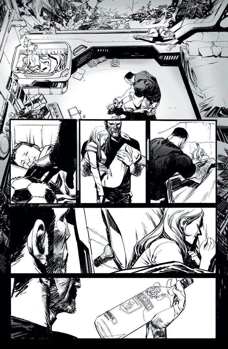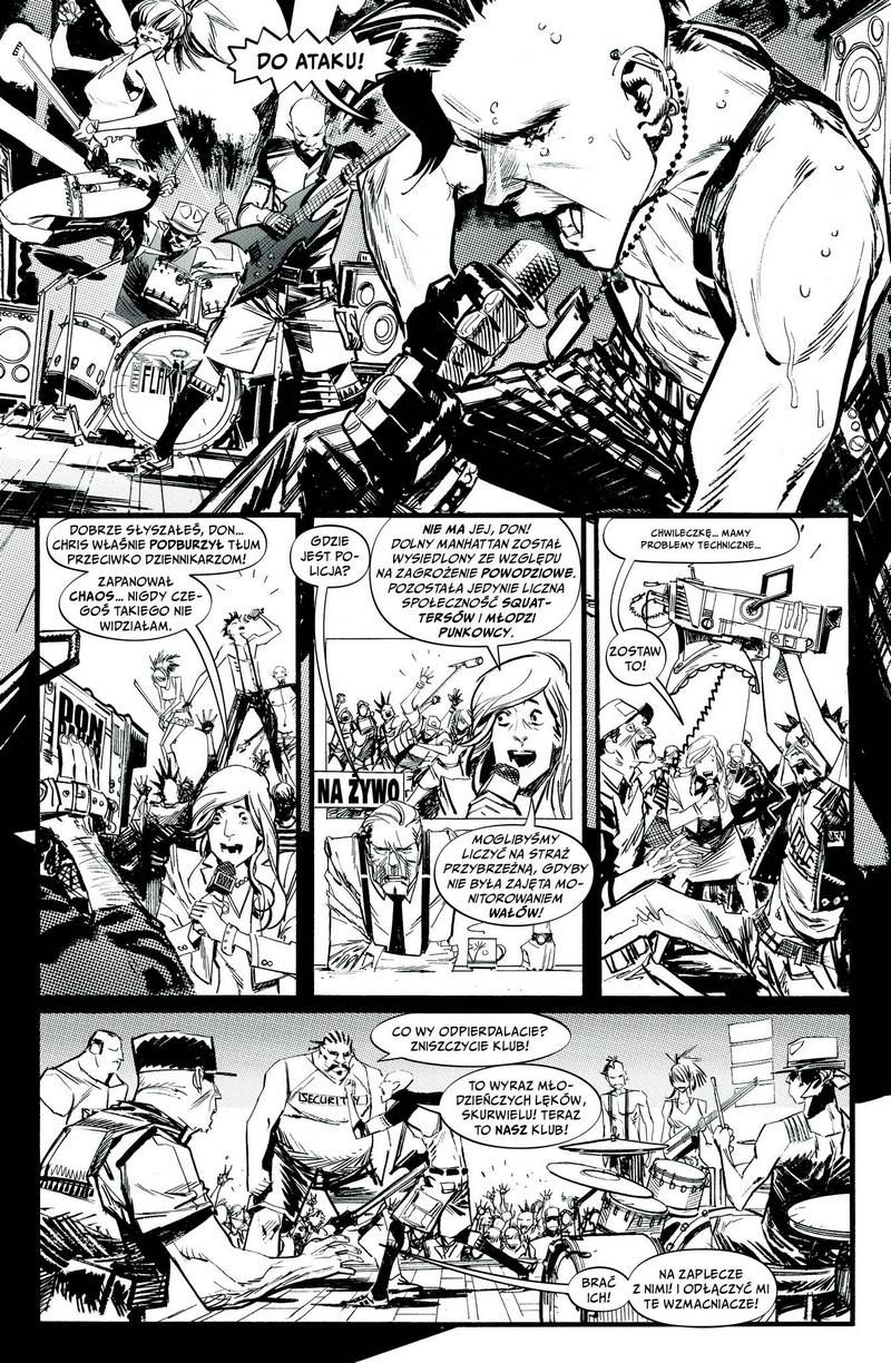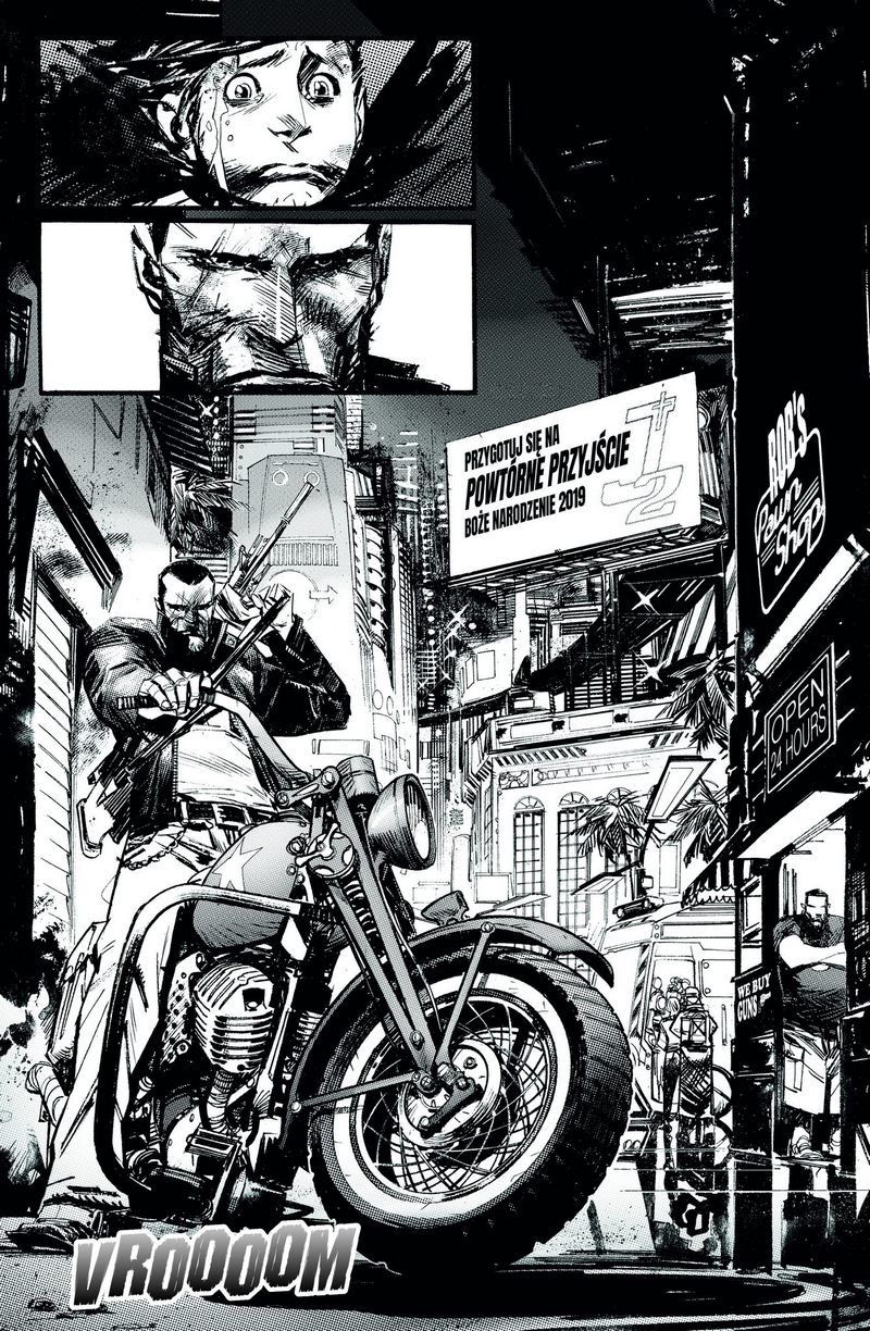 Sean Murphy to rysownik rozpoznawalny. Z wyrobionym stylem, podkreślającym oryginalność jego projektów. W Punk Rock Jesus tworzy w podobny sposób, co w Tokyo Ghost, gdzie nawet potężne chłopiszcze na motorze się zgadza, ale czerń i biel nadają tu wszystkiemu większej surowości i punkowej zadziorności. Zyskuje na tym drapieżność historii, ale traci detal poza pierwszym planem, który jest jednym z atutów ilustracji Murphy’ego. Ostatecznie jednak historia wizualnie się broni i momentami bombarduje nas emocjami gwałtownymi jak muzyka Black Flag.
