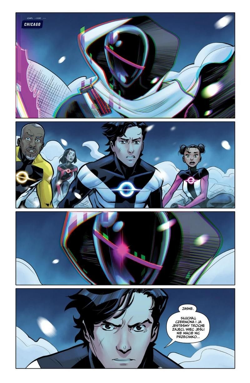 Radiant Black od początku stawiał na tę bardziej człowieczą stronę fachu superbohatera. Higgins jest świetny w tworzeniu obyczajowego zaplecza, na którego czoło wysuwa się oczywiście przyjacielska, wręcz braterska relacja Marshalla i Nathana. Nie jest to typowy bromance, bo panowie pełni są pęknięć. To nie kolejna fikcja literacka, gdzie wszystko idzie gładko bądź wprost przeciwnie – napotyka na absurdalny, mroczny opór. Podoba mi się, jak drużyna się dociera i uczy swoich zdolności. Team Radiantów nie jest może świetnie zgraną kapelą grającą na stadionach, a raczej garażowym zespolikiem ze sprzętem przekraczającym ich możliwości. Ale mają serducha do walki i rozwoju. Każdy kolejny wspólny krok przynosi pewien progres, choć czasem trzeba się zatrzymać, by nie zgubić tempa.