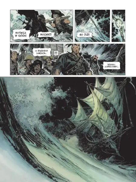 Opowieść Lauffraya ma niesamowity potencjał kinowy. Oprócz wymienionych bohaterów jest kilkoro mniej znaczących postaci, które stanowią nie tyle tło, co uzupełnienie tych pierwszoplanowych. Nie trzeba by było się wysilać z tworzeniem, wszystko podane jest na tacy. Raven to godny następca Sparrowa, a i pozostali znaleźliby swoje miejsce na scenie. Zwłaszcza że seria Piraci z Karaibów powoli umiera śmiercią naturalną. A szkoda byłoby, aby piraci poszli ścieżką kowbojów i innych kultowych archetypów, stając się jedynie okazjonalnymi gości na ekranach zdominowanych przez superbohaterów i mniej ciekawe figury. Na dodatek Lauffray jest równie dobrym rysownikiem, co scenarzystą. Niektóre plansze to wręcz gotowe story boardy.