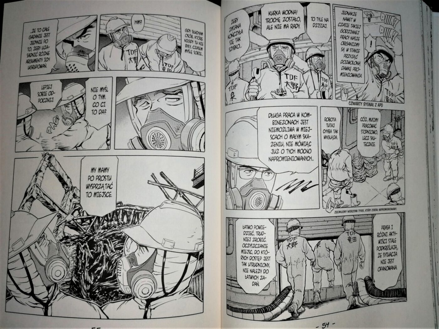 Ostatecznie po trudach Kazuto Tatsuta zostaje zatrudniony przy pracach bliżej samych reaktorów. Do jego zadań należy na przykład wymiana rur transportujących zanieczyszczoną wodę do specjalnie przygotowanych zbiorników. Tutaj także autor nie zapomina o szczegółach i bardzo dokładnie opisuje nam przebieg prac i związanych z nimi zasadami bezpieczeństwa. Podczas całej mangi Kazuto Tatsuta wielokrotnie nawiązuje do nieprawdziwych relacji w mediach o zaniedbaniach w 1F. Pokazuje, że przykładano naprawdę dużą wagę do środków bezpieczeństwa – jak przeczytacie przynajmniej pierwszy rozdział, zrozumiecie.