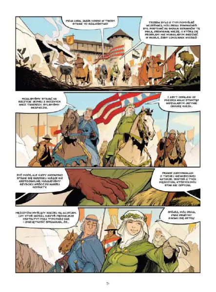 Rycerz Psi Łeb tom 2 to barwne, dosłownie i w przenośni, wieki średnie. Ronan Toulhoat stawia przede wszystkim na widowiskowe starcia i klimat bliższy średniowieczu rodem z fantasy niż realiom epoki. Wprawdzie nie ma tu nawet cienia magii, ale rycerska dynamika zapewnia równie wielką dawkę rozrywki. Wciąż podobają mi się otwierające część rozdziałów barwne plansze, pełniące funkcję wewnętrznych monologów bohaterów i przerywników głównej akcji. Yoann Guillo, odpowiadająca za te kolory, zasługuje na oklaski godne zwyciężczyni turnieju.