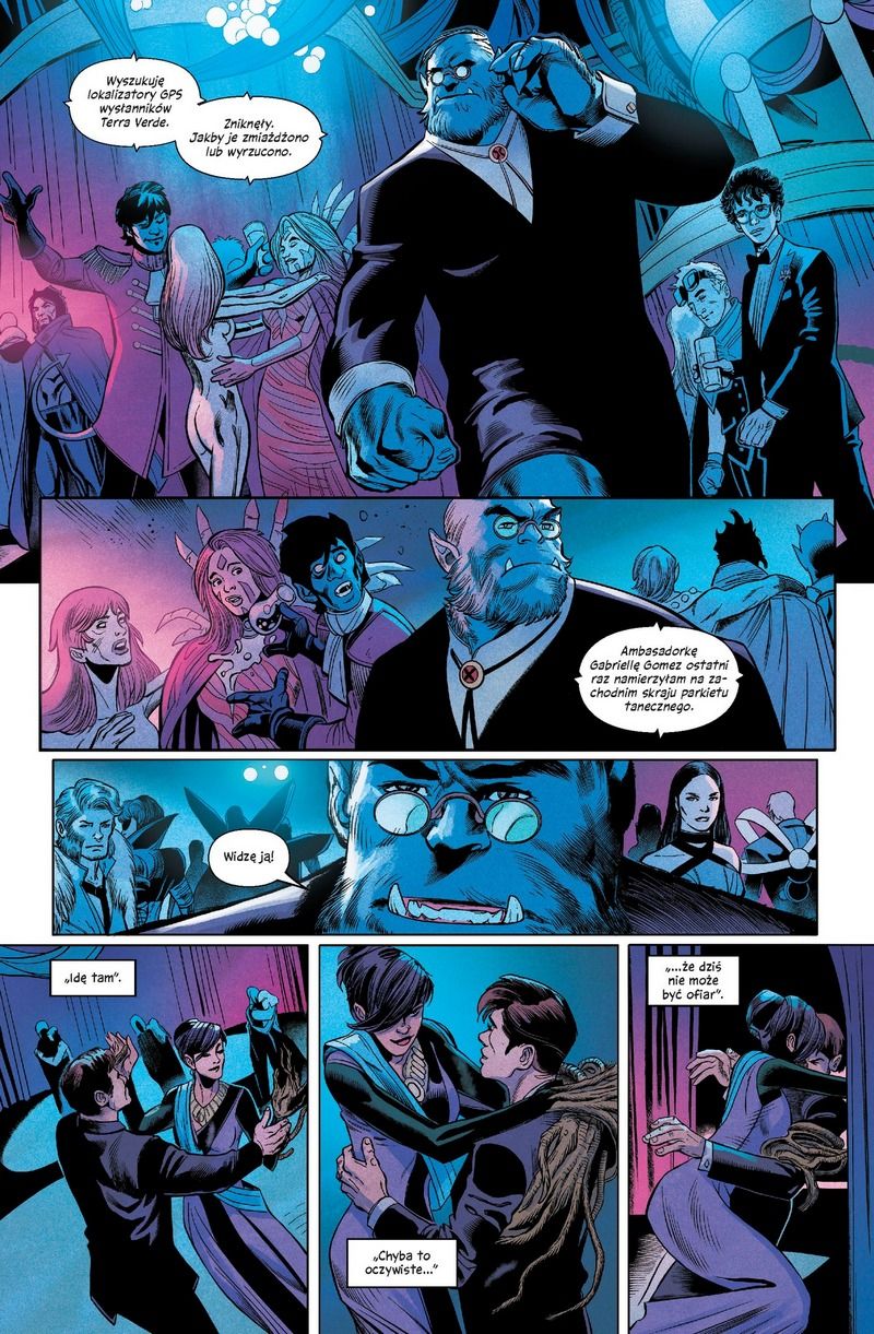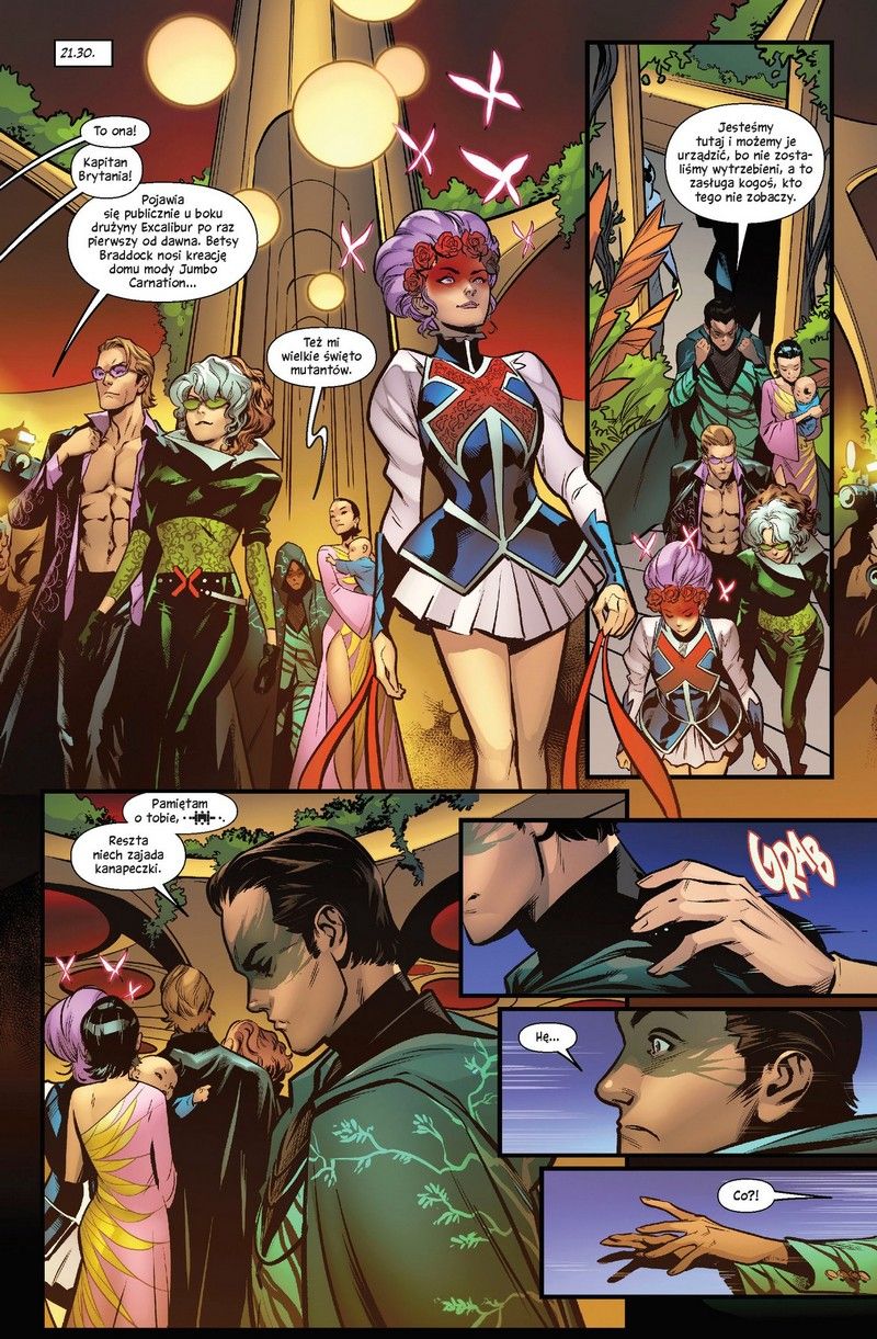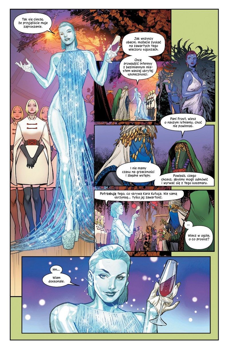 Rządy X: Hellfire Gala to więc zbiór zeszytów z kilku x-serii, w tym takich, które nie ukazały się i prawdopodobnie nigdy nie ukażą po polsku. Rysowników jest więc spora grupka, ale każdy z nich rozumie zamysł tej historii. Ma być pompatycznie, zjawiskowo i niech homo sapiens zbierają szczęki z podłogi. I to się udaje. Po pierwsze – kreacje. Naczelni mutanci noszą się odważnie, awangardowo, jakby żywcem zdjęto ich z wybiegu na pokazie mody. Prym wiedzie Emma Frost, ale niemal każdy robi tu wrażenie. Po drugie – otoczka całego wydarzenia. To nie skromny raut polityczny, a show, które jest pokazem siły. Krakoanie nie bawią się w dyplomatyczną skromność. Hellfire Gala to jak przyjęcie u tej bogatej, wrednej ciotki, która lubi pokazać swoją wyższość, ale i tak każdy przyjdzie, licząc, że coś mu skapnie z suto zastawionego stołu. No i nie mogło zabraknąć widowiskowego aspektu dynamicznego, ale utarczki są tu dość marginalne.
