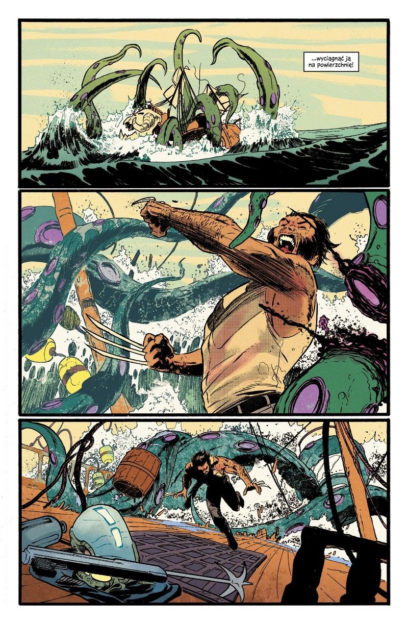 Stary mutant i morze to brutalna, ale dość typowa dla postaci Logana samotnicza opowieść o mierzeniu się z ogromnym zagrożeniem. Coś zabija x-dzieciaki w pobliżu morza. A Wolverine to najlepszy kandydat na łowcę. Percy doskonale pokazuje tu funkcję, jaką pełni Logan w społeczeństwie Krakoi. Może i bywał on członkiem Avengers i X-Men, ale faktycznie to gość, który jest najlepszy w tym co robi, a to, co robi, nie jest miłe. To ucywilizowana bestia, przyjmująca na siebie wrogie strzały. Ale też i człowiek z masą blizn.