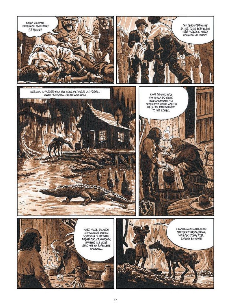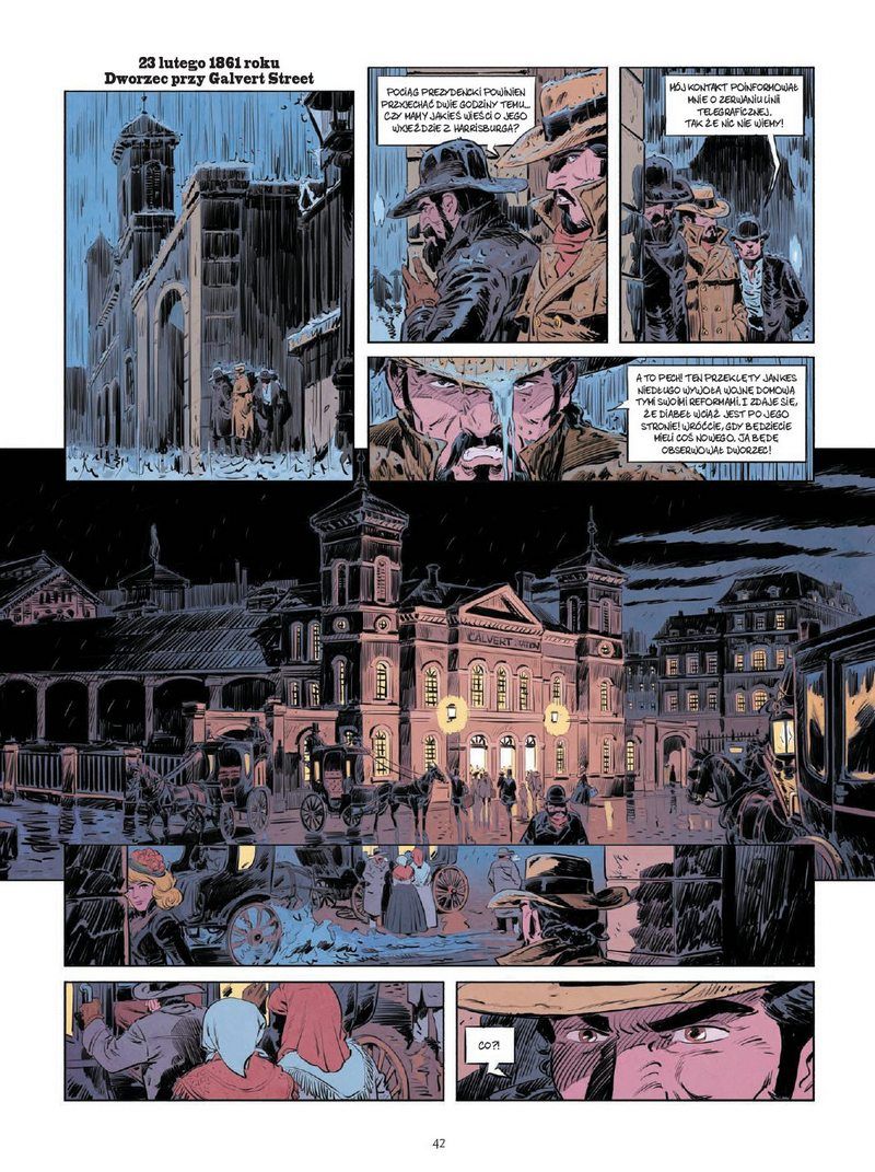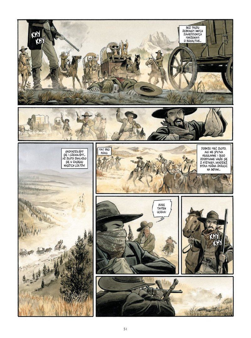 Rysownicy nie stronią od przemocy, ale to poziom pomiędzy staroszkolnymi spaghetti westernami, a Tarantino. Widać więc obrażenia, ale to nie czerwona jatka. Czemu wspominam od razu o przemocy? Komiks traktuje o stróżach porządku, a ich zadanie nie polegało na wypisywaniu mandatów. Laurent Astier z jego niedoszłym zamachem na Abe’a czy Dmitri Armand i losy rangera Wernera są moimi faworytami, ale każdy artysta pokazuje tu piękną szkołę klasycznego rysunku, ukazując pełny bukiet smaków tamtej ery. Surowej, ale i charakterystycznej w całej swej rewolwerowej oprawie. To nie Dziki Zachód z makietami budynków, a realnie zilustrowana epoka.