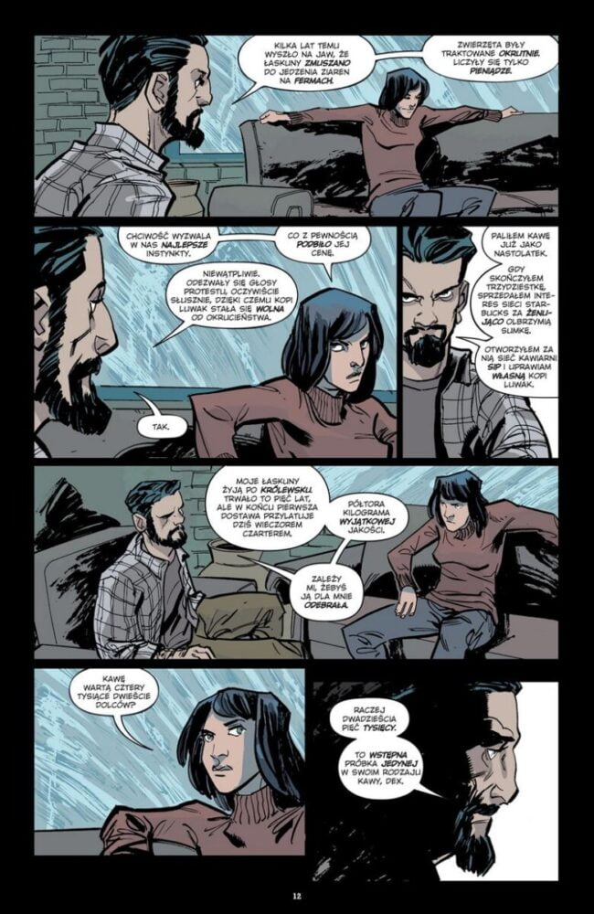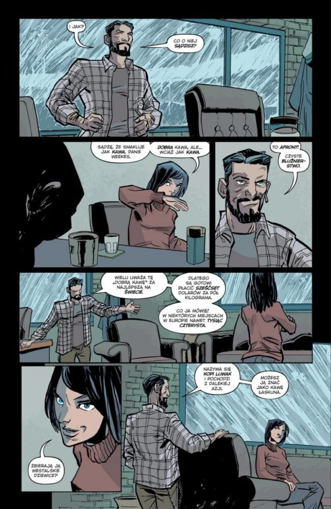 Znacie wytrawnych kawoszy? Nie takich, którzy szczególnie uwielbiają solidny czarny napar i nieźle znają się na procesie jego tworzenia, ale prawdziwych fanatyków, którzy węchem wyczują wady ziarna, nie wspominając o gotowym napoju. Z obłędem zniszczenia wpatrujących się w automaty i wylewający się z nich piekielny napój. Na pierwszy rzut oka klient Dex to właśnie taki typ. Człowiek, który poświęcił kawie swój żywot, a do tego dbający o ekologię i dobrostan wspierających go w produkcji gatunku kopi luwak futrzaków. Okazuje się, że ziarna te są na tyle drogocenne, iż ma na nie oko dość szemrany typ, a jakby Parios miała za lekko, w tym samym czasie odwiedza ją jej siostra o dość swobodnej filozofii życiowej.