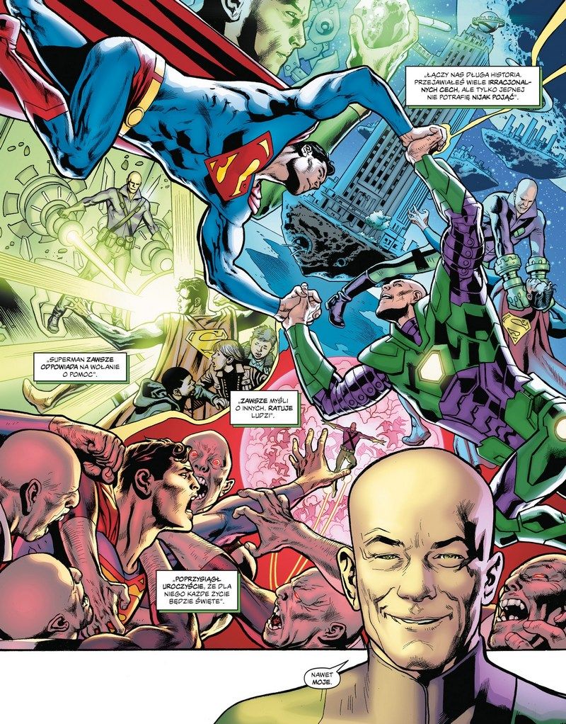 Dominuje więc heroiczna, komiksowa nuta, ale przy pełno-peleryniarskiej historii Bryan Hitch już wiele razy zdołał przemycić poważniejsze treści. Superman jest wprawdzie tym, kim jest zawsze, ale Lex od dawna nie był tak złamany. Buńczuczna, wężowa mina nie kryje symptomów postępującej choroby. Widowiskowe czyny nie przysłaniają faktu, że miliarder słabnie. I jak przy wielu historiach z DC Black Label, wszystko dzieje się za szybko. Nie mam może odczucia ziejącego niedosytu, ale z potencjalnie epokowych hitów wychodzą jedynie komiksy dobre. W tym przypadku jest to odczuwalne bardziej, bo rysunki Hitcha pchają fabułę do przodu. A między Kentem i Luthorem działo się tyle, że i dwa razy dłuższa historia nie wyczerpałaby tematu.