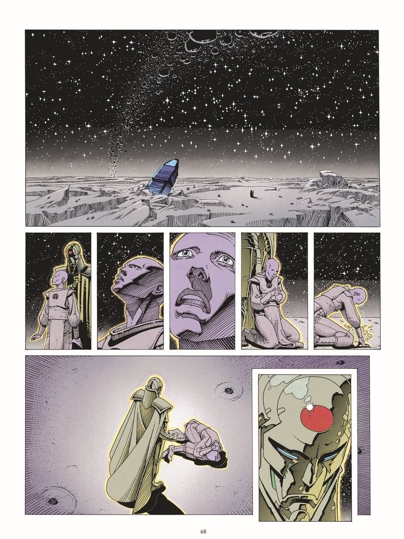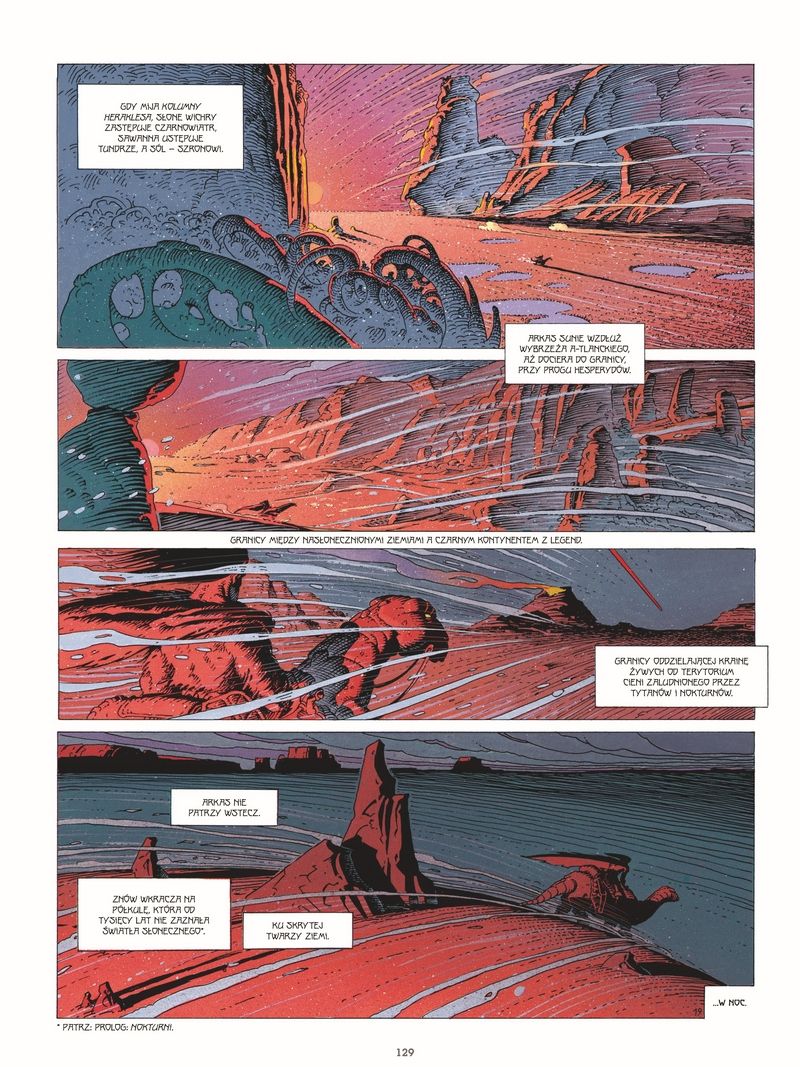 Aby zrozumieć pełnię tego, co napisałem wyżej, trzeba podsumować pewne fakty. Tytułowy świat Arkadiego to nic innego jak stara, poczciwa Ziemia. Naznaczona atomową pożogą, do tego zastygła bez ruchu, przez co jedna jej półkula palona jest bezlitosnymi promieniami słonecznymi, a druga spowita jest wiecznym lodowcem. W bonusie jej mieszkańcy otrzymują jeszcze radiację. Takie realia dają autorowi spore pole do popisu, które w pełni wykorzystuje. Obok plemion i stworów rodem z fantasy mamy zaawansowane technologicznie miasto zarządzane przez maszyny. I nawet w tej postaci nie byłoby to nic spektakularnego jak na SF. Philippe Caza to jednak nie byle twórca, a autor wielki, tworzący śmiałe dzieła.