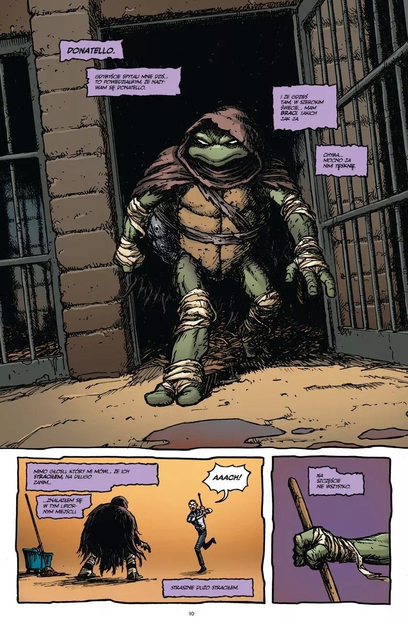 Album ilustruje grupa rysowników, wśród których znajdziecie takie nazwiska jak Rafael Albuquerque czy Darick Robertson. Nie ma tu więc słabych punktów. Już na pierwszy rzut oka widać, że jest poważniej niż w przeszłości. Zwłaszcza w przypadku Dona, który dramatycznie wychudzony i w łachmanach jest cieniem dawnego siebie. Sporo tu ciosów i kopniaków, a Żółwie w kolorowych opaskach przypominają swoim wrogom, dlaczego lepiej było trzymać się z dala od Nowego Jorku. Rozdzielenie bohaterów pozwoliło dodatkowo stworzyć różne nastroje. Obok dwóch opowieści więziennych mamy filozoficzną drogę Leonarda i show Michaelangelo. Dobrze zostało to przemyślane.