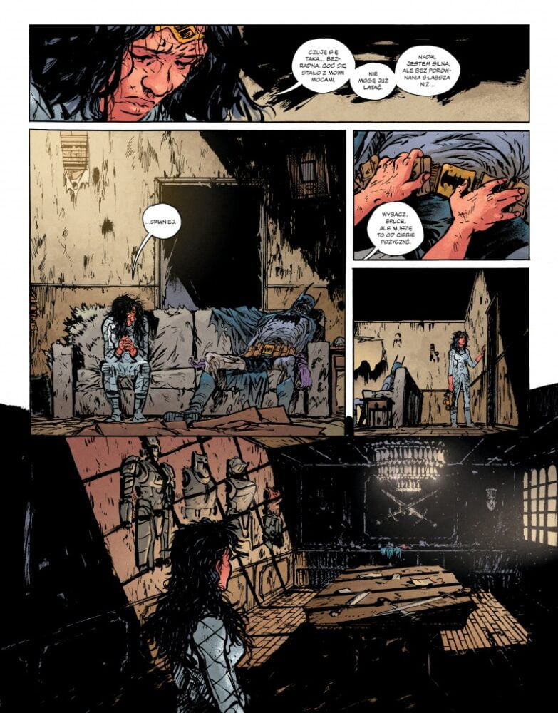 Amazonka to komiksowa piękność i większość twórców nie zbacza z tej ścieżki. Daniel Warren Johnson również, ale tu zatrzymałbym się na chwilę, bo sama kreska autora to coś zupełnie innego niż Jim Lee i jego duchowi spadkobiercy. Diana wydaje się tu nieco rozczochrana, poobijana i wyraźnie przytłoczona. Nie wspominając o „pożyczonym” bat-pasie i wzmocnieniu Lassa Prawdy z tak jakby pomocą Supermana. Brak tu majestatu Amazonki i czaru. Słowem – wszystko pasuje do epoki zagłady. I podobnie jak w przypadku scenariusza, nie musicie obawiać się tu słabej próby siłowego obalenia mitu, a raczej ukazania go w innych okolicznościach. Diana nadal wyróżnia się wśród wymiętolonej ludzkości, jej kondycja jest o wiele lepsza niż jej wieloletniej rywalki, a na pewno ma się lepiej niż jej siostry. Znakomitą pracę wykonał też Mike Spicer, który nakładając kolory pokazał, że postapokaliptyczna rzeczywistość nie musi być skąpana w depresyjnych barwach.
