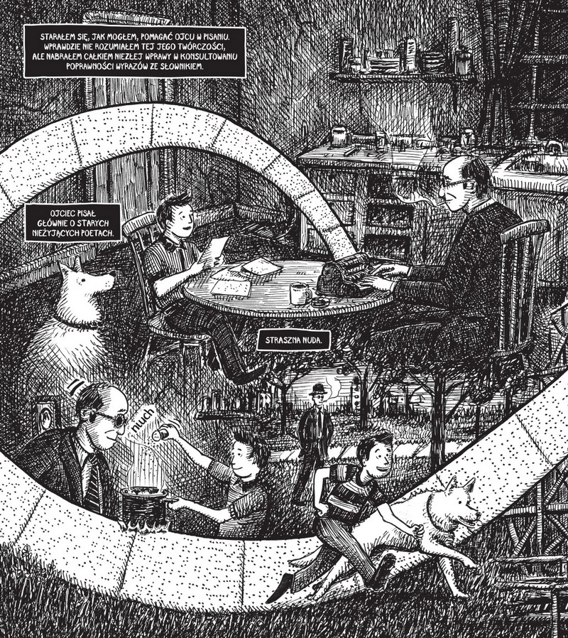 Niemal zapomniałbym przy tym wszystkim o kręgosłupie tego komiksu, czyli relacji syna i ojca. Matt ma duszę mentora, który pomimo swych ograniczeń jest lepszym nauczycielem i ojcem niż setka innych tatuśków. Bombą niszczącą niemal ich więź jest kłamstwo Matta, które już w przeszłości zaważyło na losach jego i jego rodziny. Co spowodowało, że mężczyzna zdecydował się wykreować kłamliwą historię? Wstyd za swój czyn z młodości i pobyt w więzieniu, pomimo że to ono ukształtowało go jako człowieka kultury? Wypadek na polowaniu nie jest historią dającą jednoznaczną odpowiedź. Carlson mnoży wątki. Jednocześnie mamy historię ojca i syna, opowieść o pobycie w więzieniu i jego przyczynach, nawiązania do Boskiej komedii oraz samą powieść tworzoną przez Rizzo seniora. Całość byłaby ciężka w zrozumieniu jak ustawy o podatkach, gdyby nie kunszt pisarski Carlsona, ale i ilustracje, jakie tworzy Landis Blair.