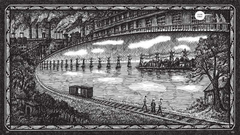 Rysunkom w komiksie Wypadek na polowaniu powinno się poświęcić osobny artykuł, gdzie co ważniejsze kadry byłyby szczegółowo analizowane. Może zacznę od kwestii technicznych. Landis Blair to artysta tworzący w czerni i bieli. Jego kreska jest na pierwszy rzut oka ciężka i przywołująca skojarzenia z kryminałem lub grozą. I choć wątek kryminalny tu występuje, to charakter historii jest od niego odległy. Blairowi udało się złapać ducha więziennego rozwoju osobowości Matta. Jego upadków i wzlotów, dziwnej przyjaźni ze współwięźniem i tego, jak na nowo zaczął postrzegać świat. Równie istotne są też rozdziały poświęcone jego relacji z Charlie’m. Chicagowska Mała Italia nie była w czasie trwania akcji urokliwym, turystycznym dystryktem, a kwartałem rodzącym przestępców. Może to nie Chłopcy z ferajny, ale Paulie i jego lokal pasowaliby do otoczenia mieszkania Rizzów. Kolejnym miejscem ważnym dla komiksu jest więzienie, zbudowane na planie panoptykonu, swą strukturą przypominająca dantejskie kręgi piekielne i dające rysownikowi pole do metafizycznych wojaży.