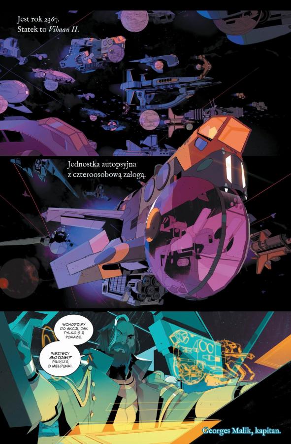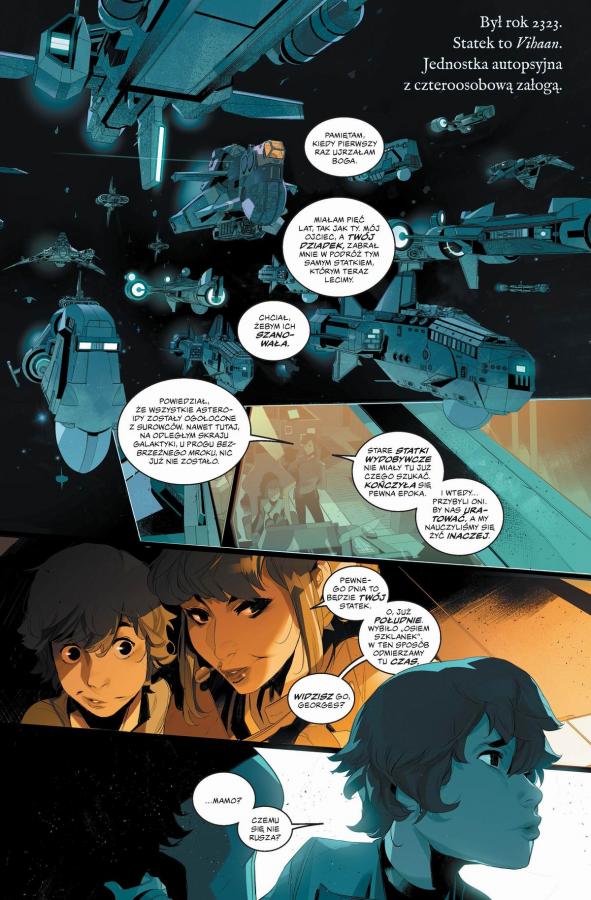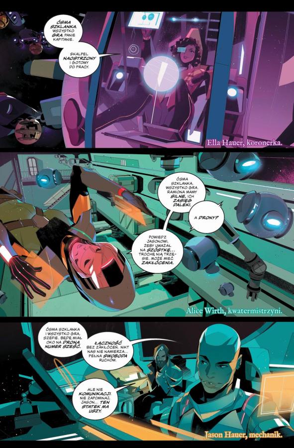 Rysunki w Znajdujemy ich, gdy są już martwi stanowią przykład tego, że silnie naznaczone cyfrą rysunki potrafią być piękne. Simone Di Meo balansuje wręcz na granicy animacji, kadry wydają się jedynie zatrzymaną klatką i nie bez przyczyny skojarzyło mi się to z pewną klasyczną produkcją, mianowicie z dziełem ze świata Star Wars noszącym tytuł TIE Fighter. Może dlatego tak sobie to powiązałem, że statki, lasery, ale i sam Di Mateo ma nieco mangowy styl? Choć dość nieoczywisty. Artysta posługuje się też mocnymi, kosmicznie oślepiającymi barwami, nadającymi wydarzeniom wyrazistości. Muszę pochwalić go też za projekt kosmicznych bogów, w których gdzieś przemyka mi cień twórczości Kirby’ego. A skoro wspomniałem o sadze Lucasa – czyż tytułowe napisy na okładkach serii nie mają w sobie tego samego majestatu, co czołówka każdej produkcji z uniwersum Gwiezdnych wojen?